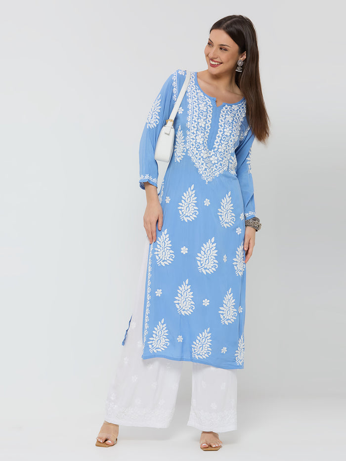 Modal Chikankari Solid Women's Long Kurta - Blue